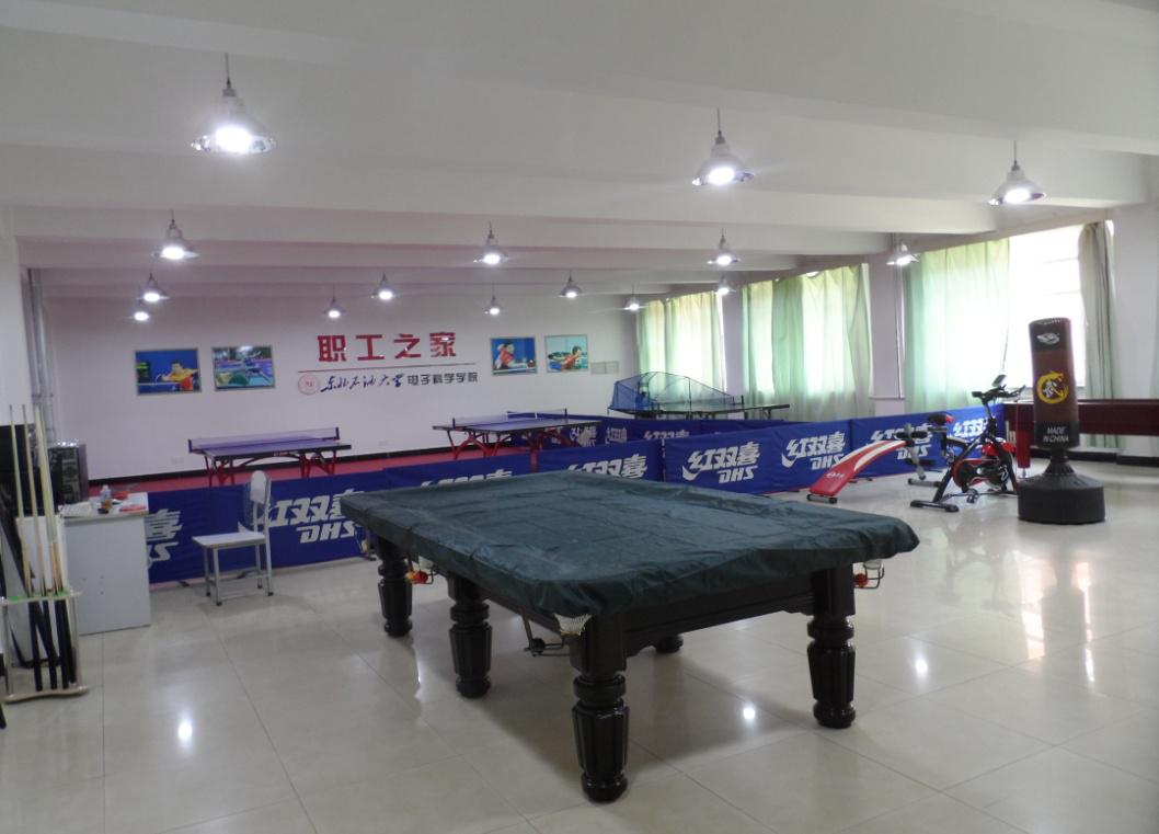 为了落实校工会职工之家建设的要求,丰富教职工的业余文化生活,加强教职工的身心健康,保证教学、科研和管理的正常进行,2016年3月21日,电子科学学院职工之家正式落成,职工之家内铺设塑胶100平米,内有乒乓球台3副、乒乓球发球机1台、台球案子1个、跑步机1台、健身自行车1辆、组合健身器1台、哑铃1套、拳击练习器1个、沙狐球台1个、腹肌板1个。