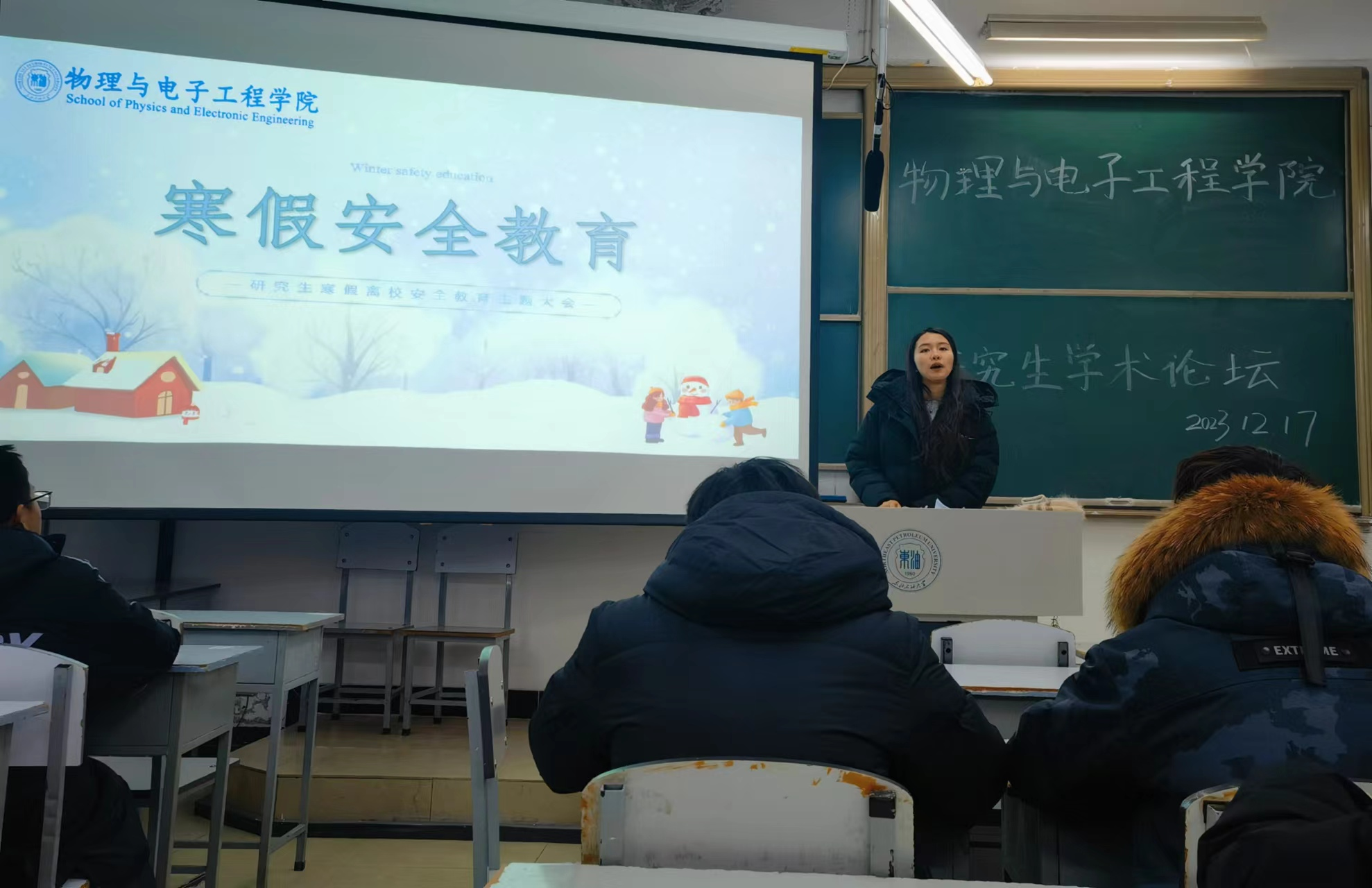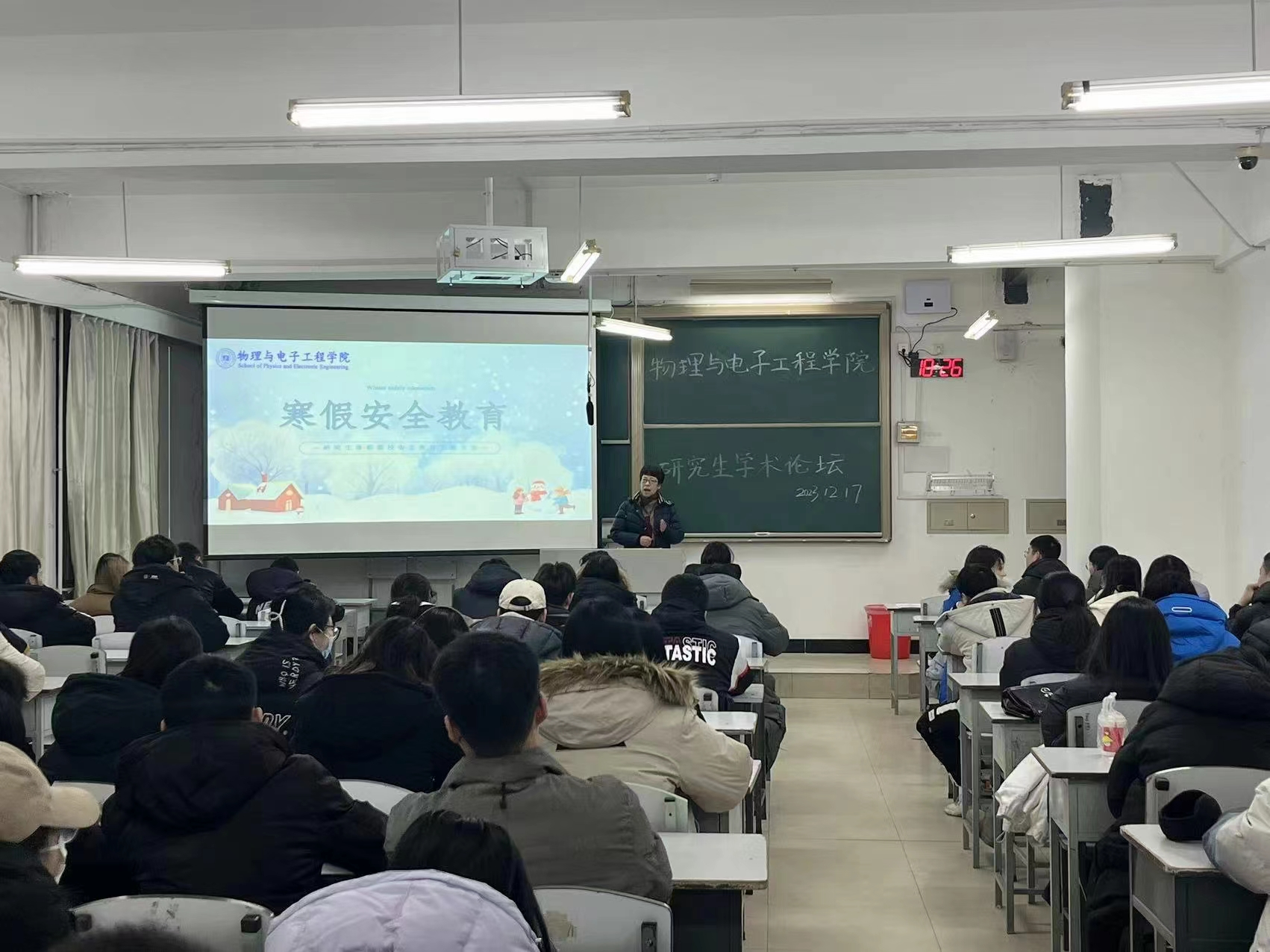 为进一步落实研究生冬季学期及寒假离校相关工作,加强安全意识主题教育,12月17日18:00,学院在1F-319召开2023年研究生寒假离校安全教育大会,正处级辅导员王丽莉、辅导员张雪莹及2022级、2023级全体研究生参加此次会议。