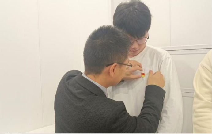 为了激励新党员,刘超为本学期新接收预备党员佩戴党徽。新入党的同学们表示:将时刻铭记党员身份,不断提升自我,争当模范。