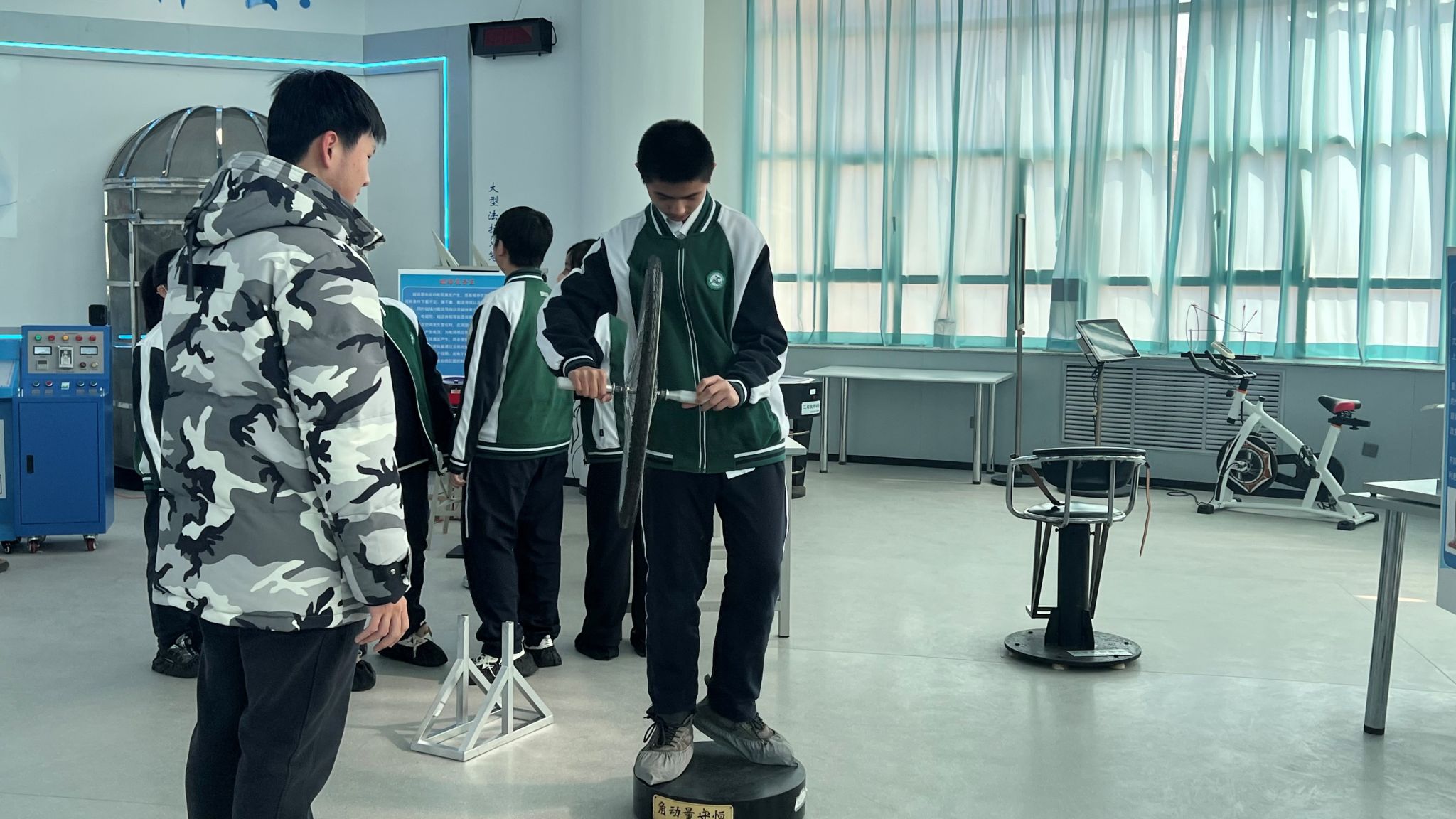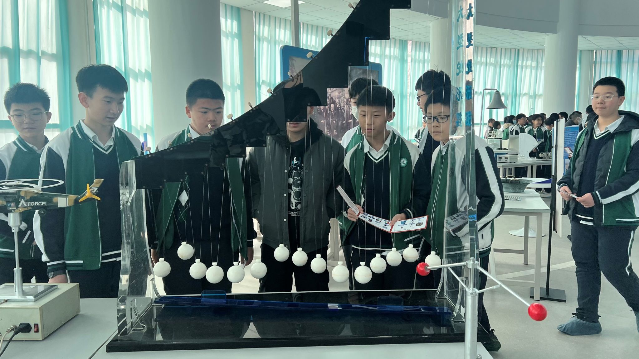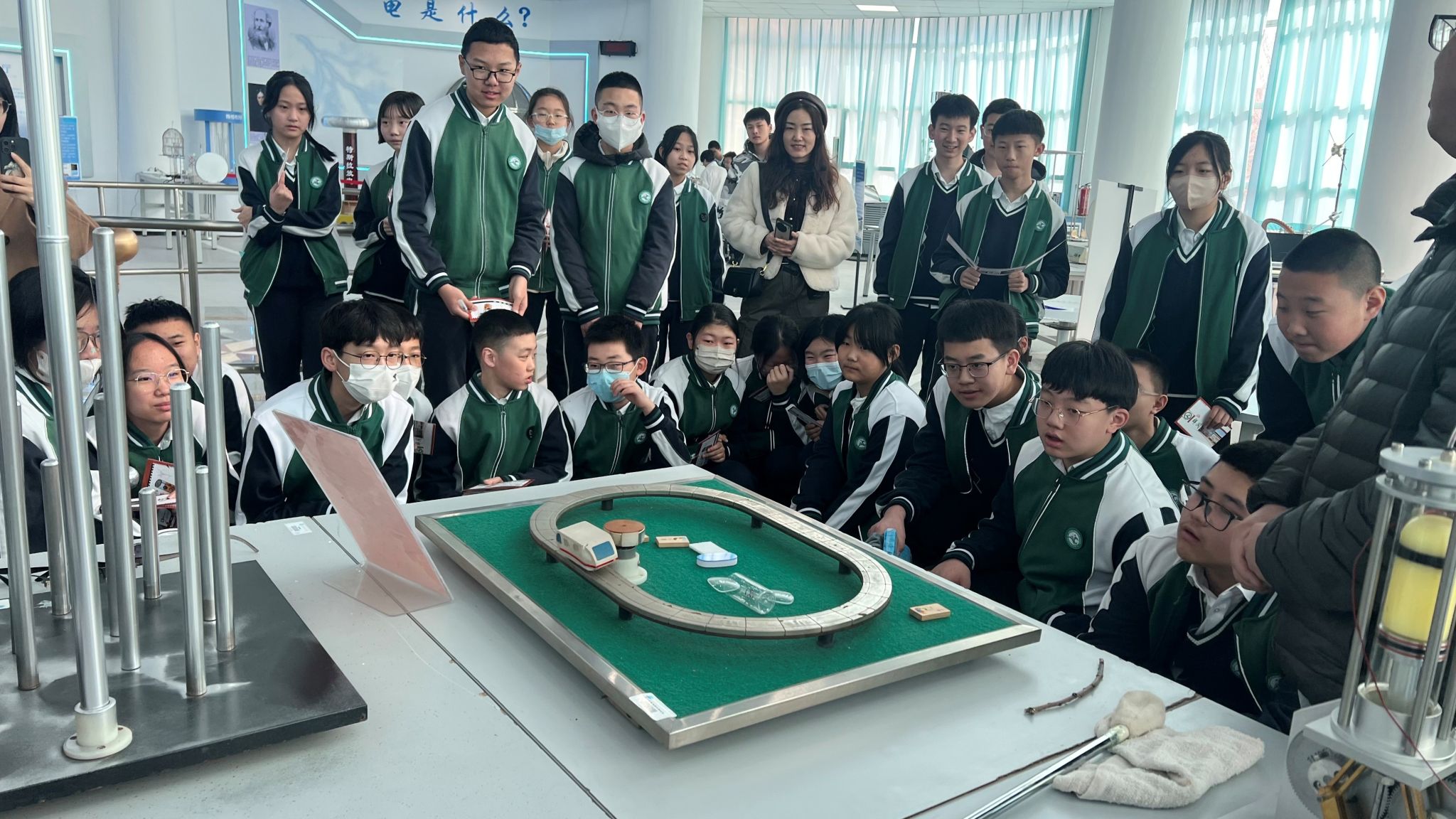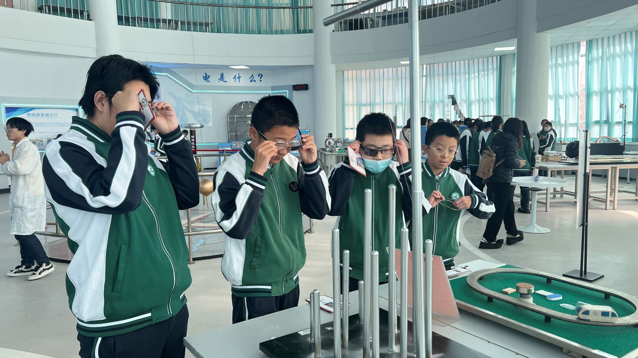 在物理探索演示馆内,学生们通过五大主题展区深度体验科学的魅力。光学幻影展区利用全息投影技术,生动演绎了光的波粒二象性;力学互动装置让牛顿三定律变得触手可及;在高压静电实验区,3.5万伏的闪电在法拉第笼外炸裂,笼内的学生却安然无恙,亲身感受了“静电屏蔽”的奇妙现象;超导磁悬浮展台前,零下194℃的液氮使普通铁块瞬间悬浮,直观诠释了量子锁定效应;能量守恒自行车让学生通过动能发电竞赛,切身领悟能量转换定律。一位学生在研学笔记中写道:“当看到傅科摆平面缓缓偏转时,我终于明白了‘坐地日行八万里’的科学内涵。”