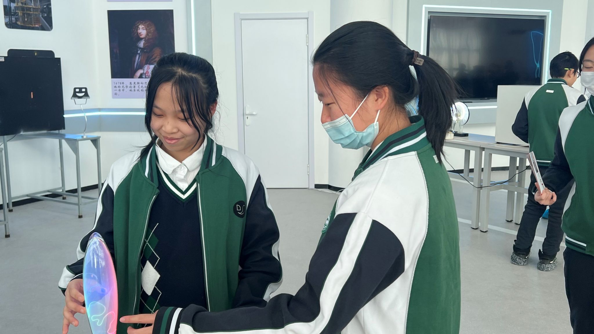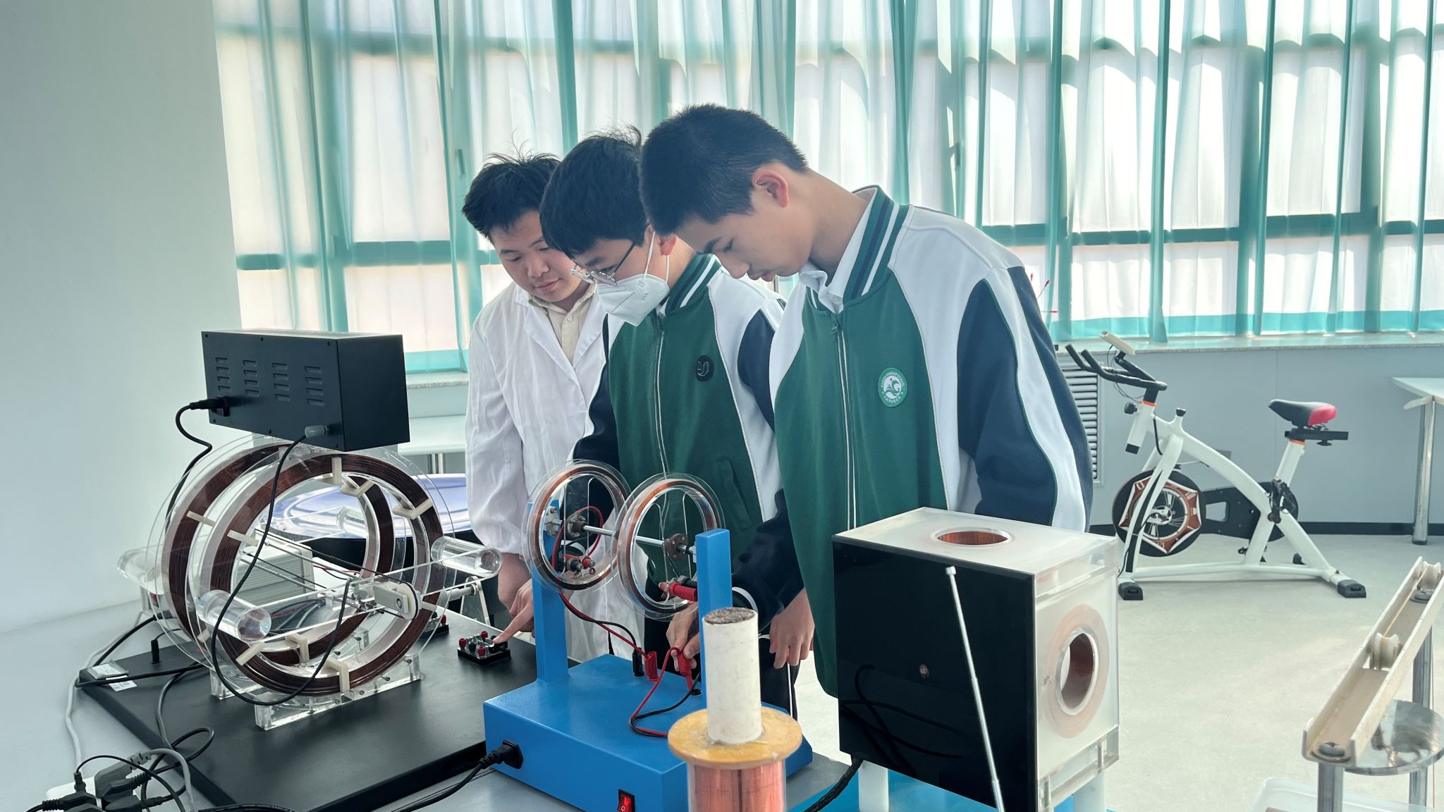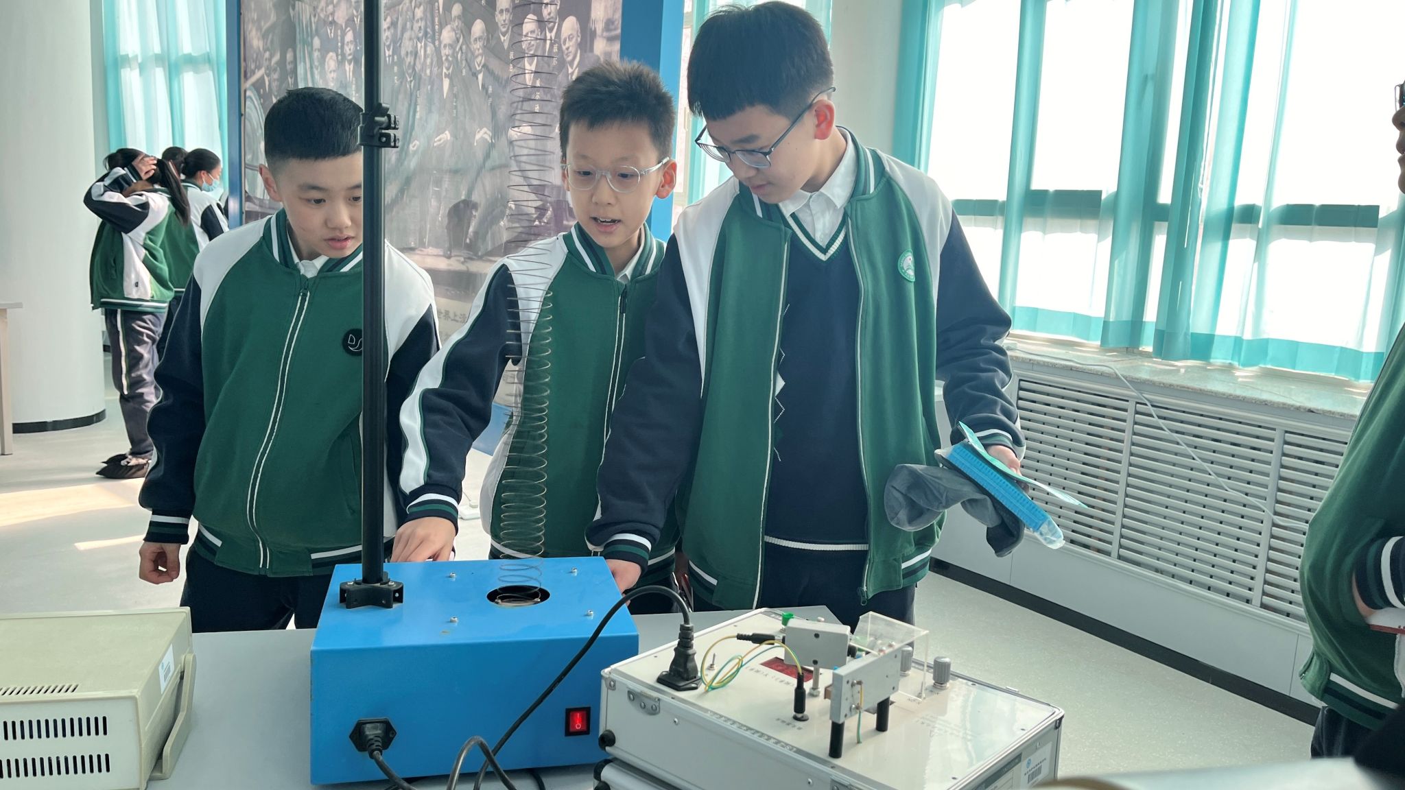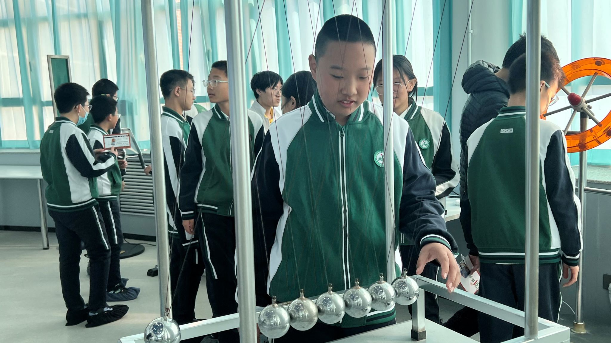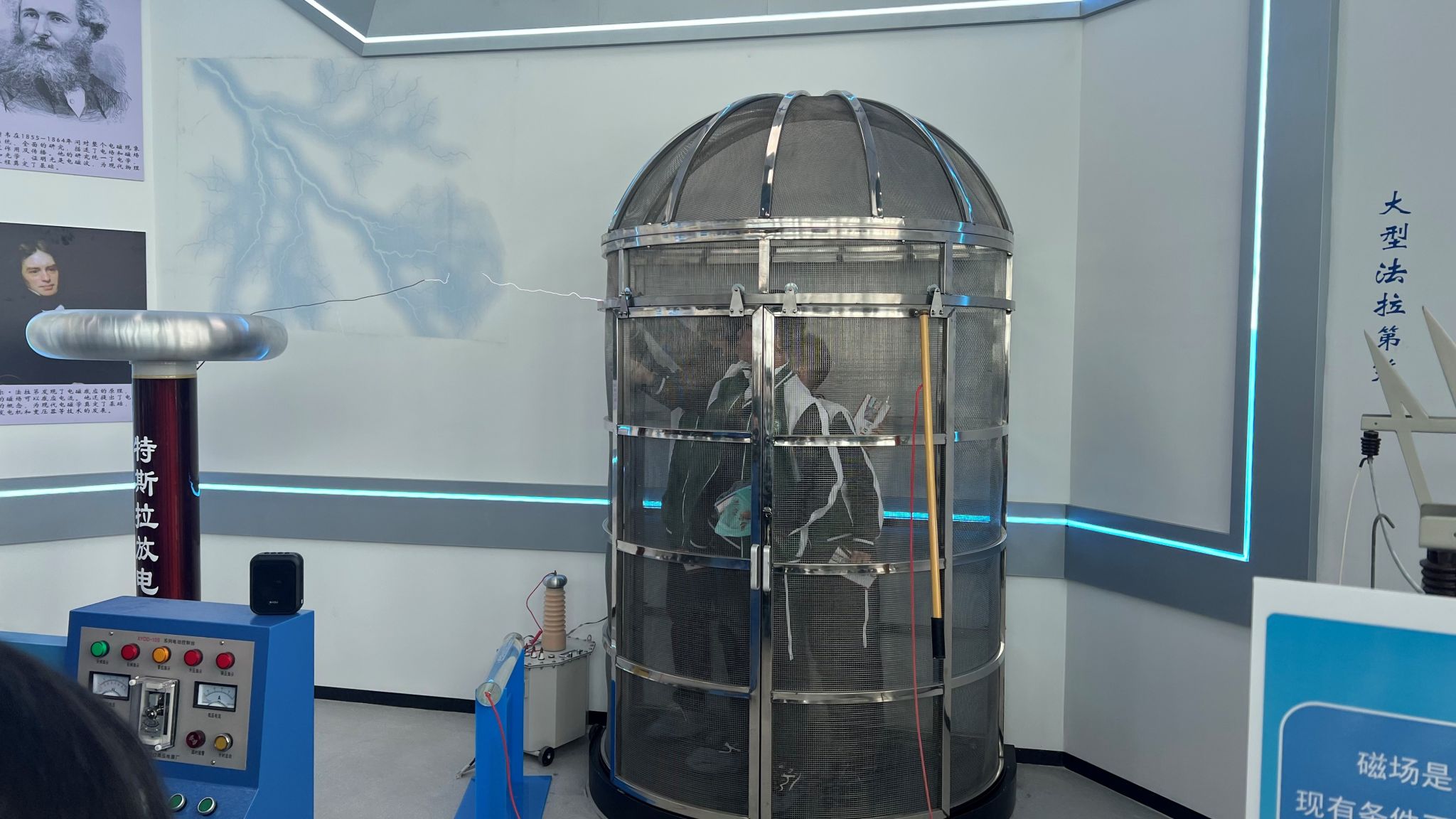 在物理探索演示馆内,学生们通过五大主题展区深度体验科学的魅力。光学幻影展区利用全息投影技术,生动演绎了光的波粒二象性;力学互动装置让牛顿三定律变得触手可及;在高压静电实验区,3.5万伏的闪电在法拉第笼外炸裂,笼内的学生却安然无恙,亲身感受了“静电屏蔽”的奇妙现象;超导磁悬浮展台前,零下194℃的液氮使普通铁块瞬间悬浮,直观诠释了量子锁定效应;能量守恒自行车让学生通过动能发电竞赛,切身领悟能量转换定律。一位学生在研学笔记中写道:“当看到傅科摆平面缓缓偏转时,我终于明白了‘坐地日行八万里’的科学内涵。”