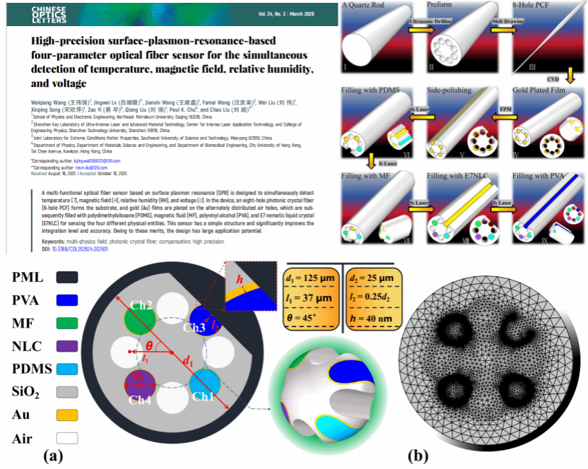 论文信息:High-precision surface-plasmon-resonance-based four-parameter optical fiber sensor for the simultaneous detection of temperature, magnetic field, relative humidity, and voltage. CHINESE OPTICS LETTERS,2025,24(3):032601