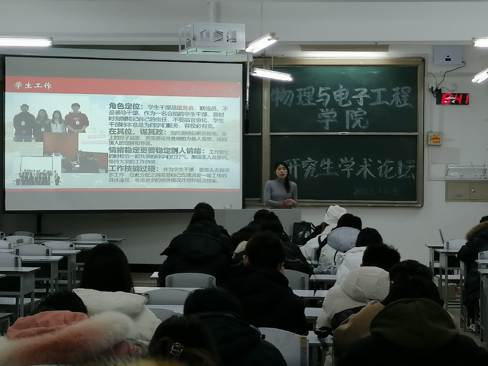 首先,韩明珠介绍了关于课程、科研工作以及竞赛的心得与体会。随后,韩明珠阐述了兼顾学生工作和学习的方法与技巧。最后,她通过许多方式来帮助研一学生对自我拥有更新的认知。