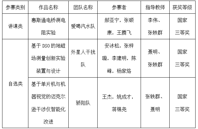 东北石油大学通过全校范围内的校级物理实验竞赛预赛选拔,金沙集团1862cc成色大学物理实验中心选拔5支队伍参赛,经过初赛和决赛,获得三等奖三项,同时我校获得优秀组织奖。讲课赛道,爱喝汽水队的作品“惠斯通电桥测电阻实验”获国家三等奖;自选赛道,外星人干扰队的作品“基于DSO的地磁场测量创新实验装置与设计”荣获国家三等奖,骄阳队的作品“基于单片机与机器视觉的迈克尔逊干涉仪智能化改进”荣获国家三等奖。