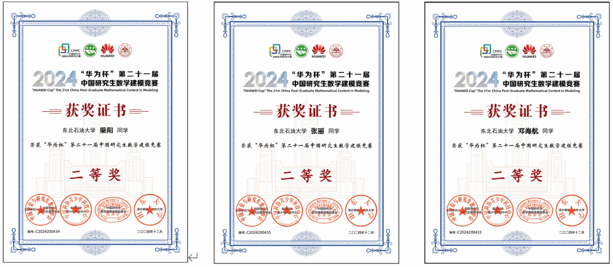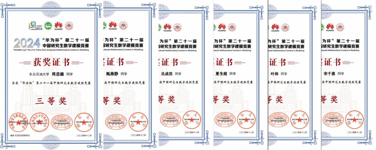 2024年11月11日,“华为杯”第21届中国研究生数学建模竞赛评审结果公布。我院研究生在本次竞赛中喜获全国二等奖1项、三等奖2项。其中,C题队伍梁阳、张丽、邓海航团队斩获二等奖;C题队伍夏生超、叶林、宋千喜团队,E题队伍吴成浩、周思璐、甄燕静团队荣获三等奖,充分展现了我院研究生的实力和团队协作能力。