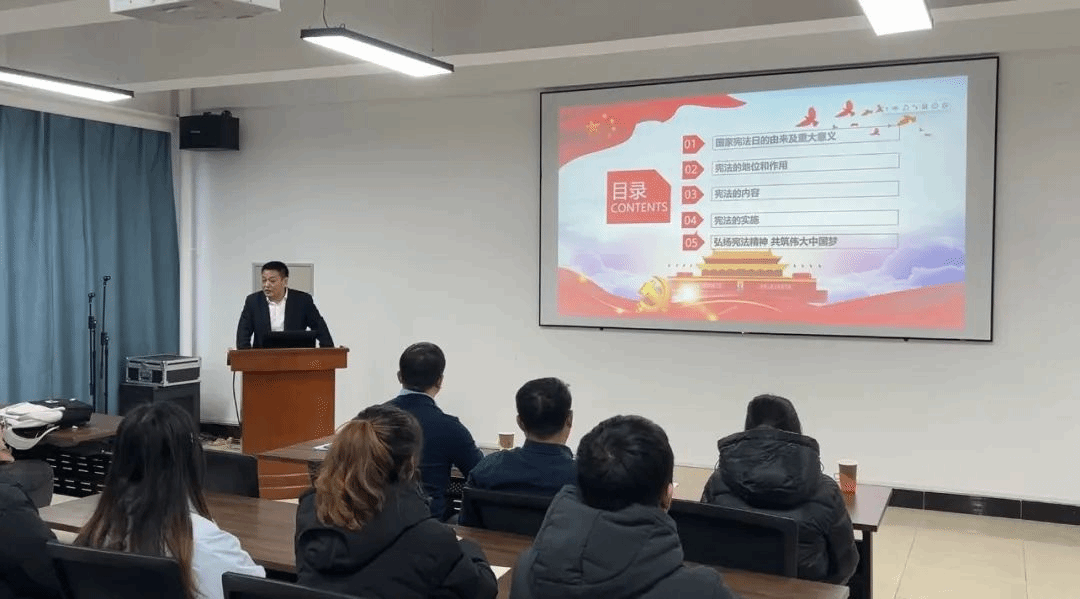 宫学成同志以“弘扬宪法精神、共筑伟大中国梦”为主题,为我院师生进行了主题宣讲。他从学生们的成长经历和日常生活入手,结合相关专业法律规定、对照宪法相关条款,由浅入深地讲解了宪法的主要内容。结合宪法的地位和作用、我们党和国家取得的历史性成就,传达了习近平总书记的重要讲话重要指示精神,讲解了国家宪法日的由来和重要意义、宪法在党和国家各项事业中的重要作用。结合公民的基本权利和义务,讲解了每名公民享有的宪法法律权利和义务,激励引导同学们尊崇宪法、维护宪法权威,全面贯彻习近平新时代中国特色社会主义思想,与新时代同向同行、与党和人民共同前进,为全面建设社会主义现代化国家、全面推进中华民族伟大复兴而努力奋斗。