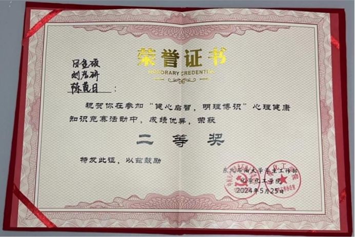 经过院内选拔推荐、学校决赛等环节,最终由田金硕、刘孝研、陈苋日同学组成的学院代表队在本届心理健康知识竞赛中获得二等奖。