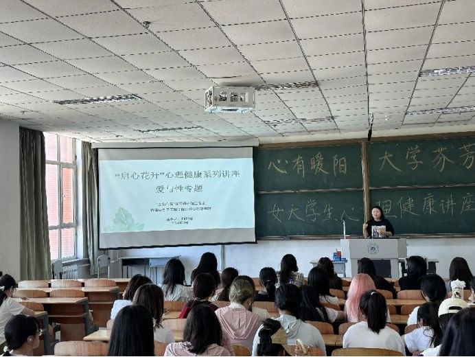 6月12日,学院在主教C区201室举办“心有暖阳,大学芬芳”女大学生心理健康讲座。阿茹娜老师从爱情的涵义、爱情三角理论、培养维持爱等方面讲授爱情的真谛,再从大学生性心理特点、科学使用计生用品、预防艾滋病等角度科普性健康知识,培育学生树立正确的婚恋观。