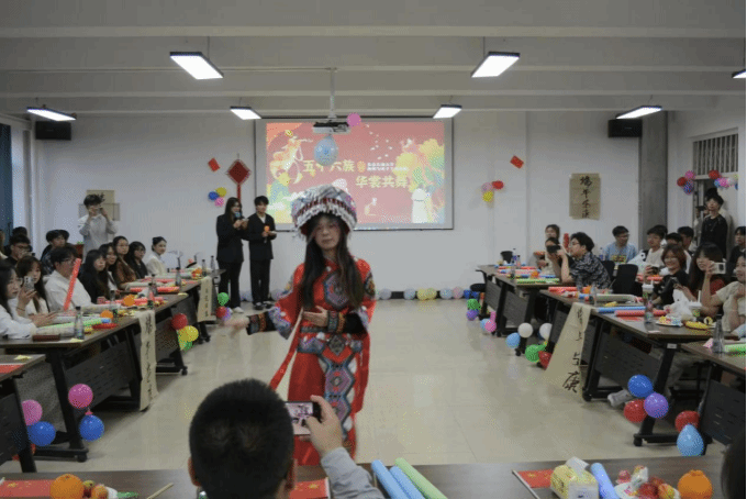 “霓裳长河”为主题的民族服饰走秀惊艳亮相,九位同学身着各民族的盛装,款款登台。藏族曲巴袍的粗犷威武、苗族银饰的璀璨灵动、朝鲜族衣裙的素雅飘逸、土家族纹样的山水意趣、朝鲜族衣裙的素雅飘逸……每一套服饰都承载着独特的文化密码与民族智慧,犹如一幅流动的中华文化画卷,生动诠释了“五十六族华裳共舞,多元一体美美与共”的深刻内涵,赢得现场阵阵掌声。